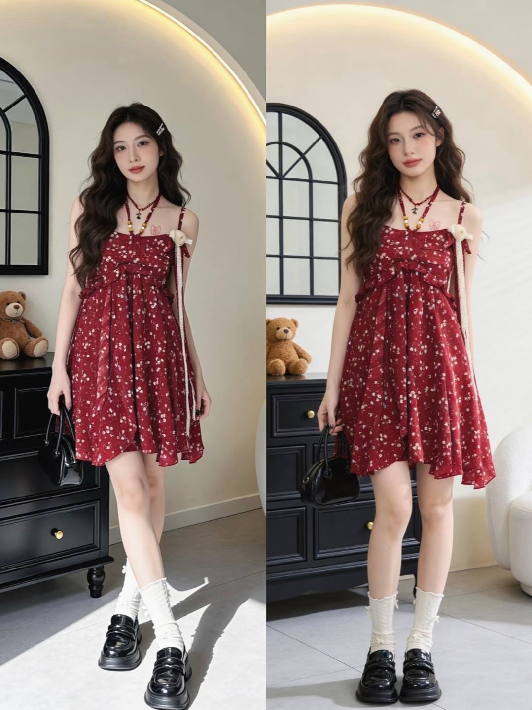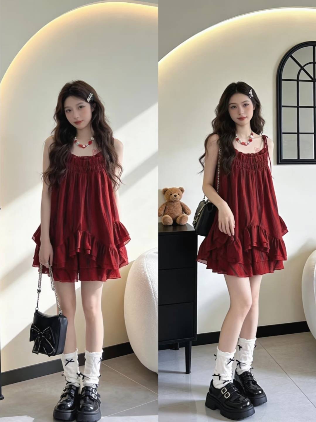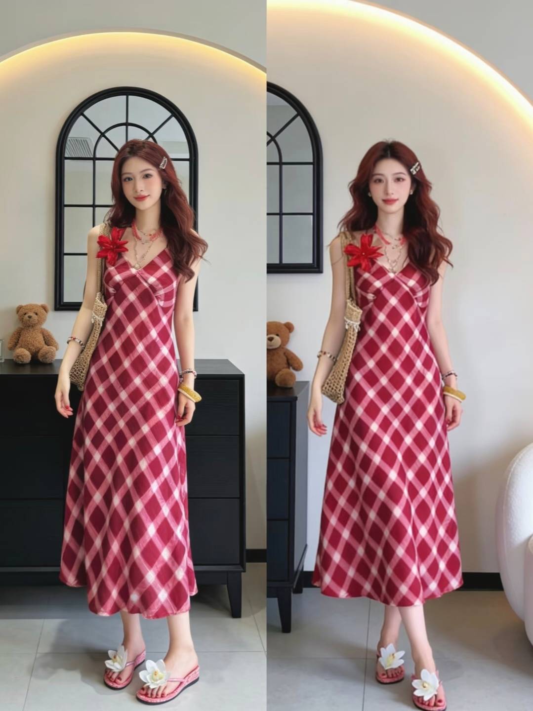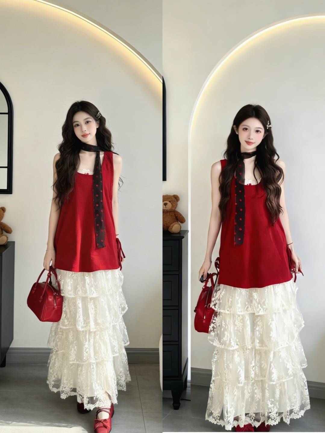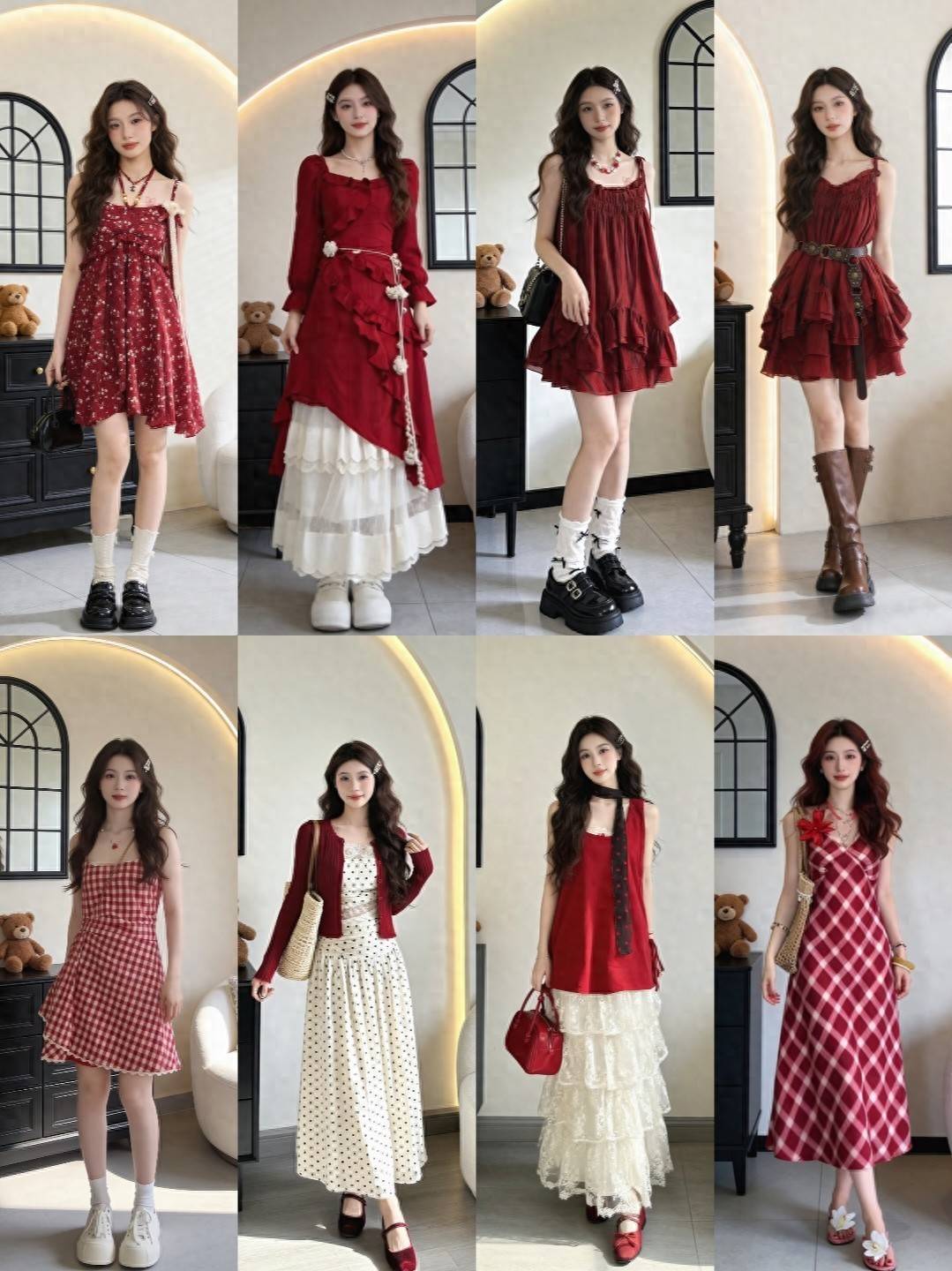 褶皱吊带裙的灵动,蕾丝长裙的温婉,格纹长裙的复古,每一套都像从油画里走出来的一样。