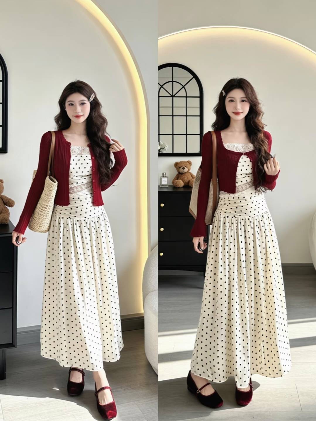 甜妹能穿蓬蓬裙搭厚底鞋,温柔挂pick波点长裙配针织开衫,酷飒姐选格纹长裙配草编包,