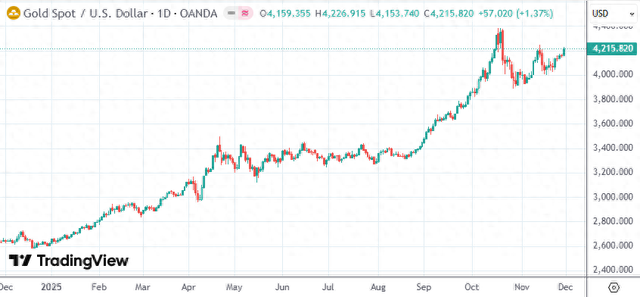 受联储降息预期提振,现货黄金周五升至每盎司4215美元,年初至今累计上涨超60%。10月8日时,现货金价首次突破4000美元这一关键水平,并于一个月前录得4381美元的历史高位。